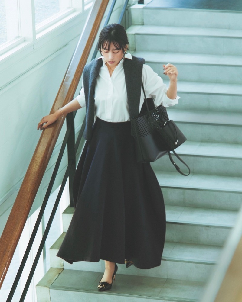 毎日出勤だけど、荷物は少なめで服装もわりとゆるめ。暖房で意外と暑いオフィスでは冬でも薄着がちょうどいいから、きれいめダウンにコンパクトなミディバッグが使い勝手抜群。仕事→その後の楽しい予定を華麗に横断できる!