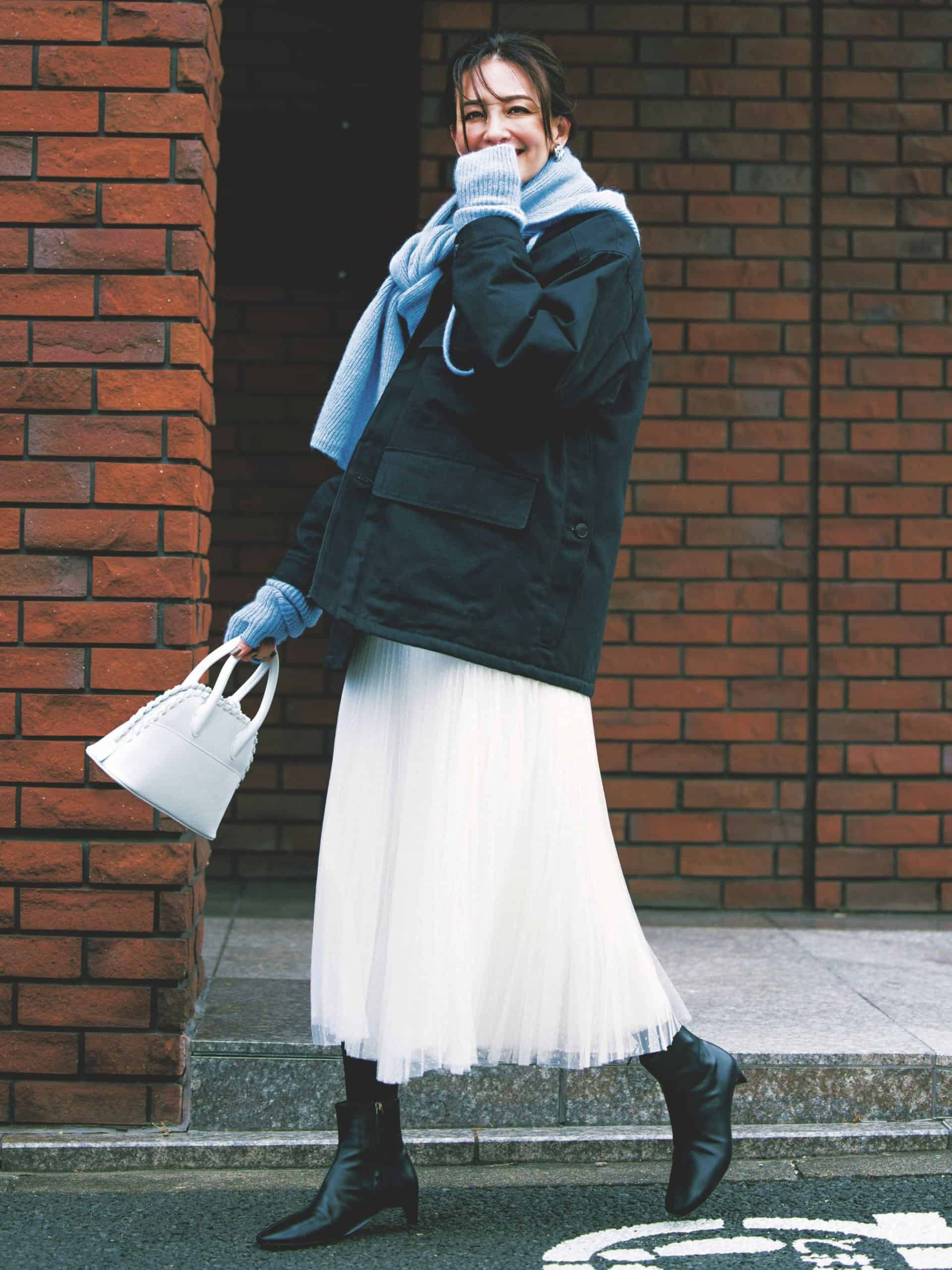ボリュームスカートも一旦封印!甘くない淡カラーを重ねた縦長シルエット。昔感とは一線を画す今どきⅠラインで切れ味よく。