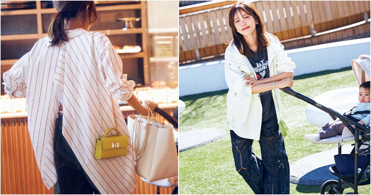 ニットトップス¥22,000(ロペ)パンツ¥35,200(エイトン/エイトン青山)腰に巻いたシャツ¥31,900(ティッカ)バッグ¥14,300(ケッシュ ル エッセンシャル)ピアス¥9,900(トゥデイフル/LIFE’s 代官山)