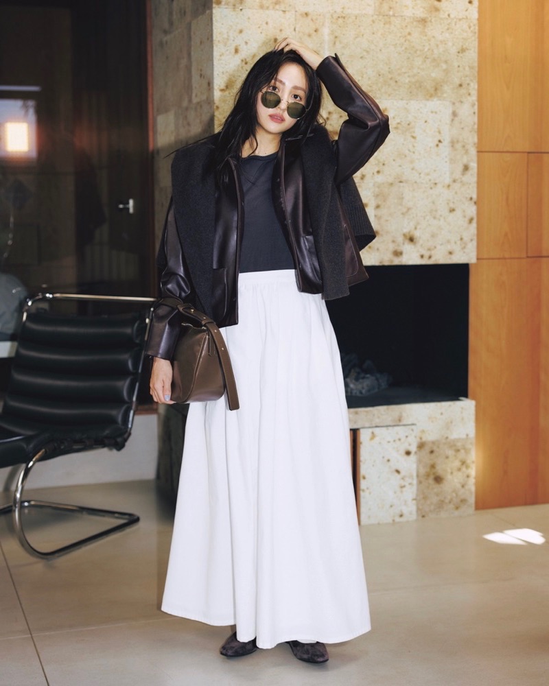 この秋冬はレザージャケットの出番が多くなりそうな予感。マニッシュ要素が目立つスタイリングはあえて柄バッグやエナメルのバレエシューズを投入し、可愛らしさを味付けします。ジャケット¥29,700インナー¥10,010(ともにGajess)スカート¥38,500バッグ¥33,000(ともにガニー)タイツはWolford、靴はRepetto、ピアスはJENNIFER BEHR(私物)