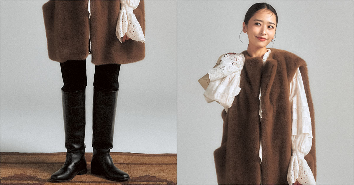 コンサバ見えなポンチョも今年らしいエコレザーでトレンド感も盛って