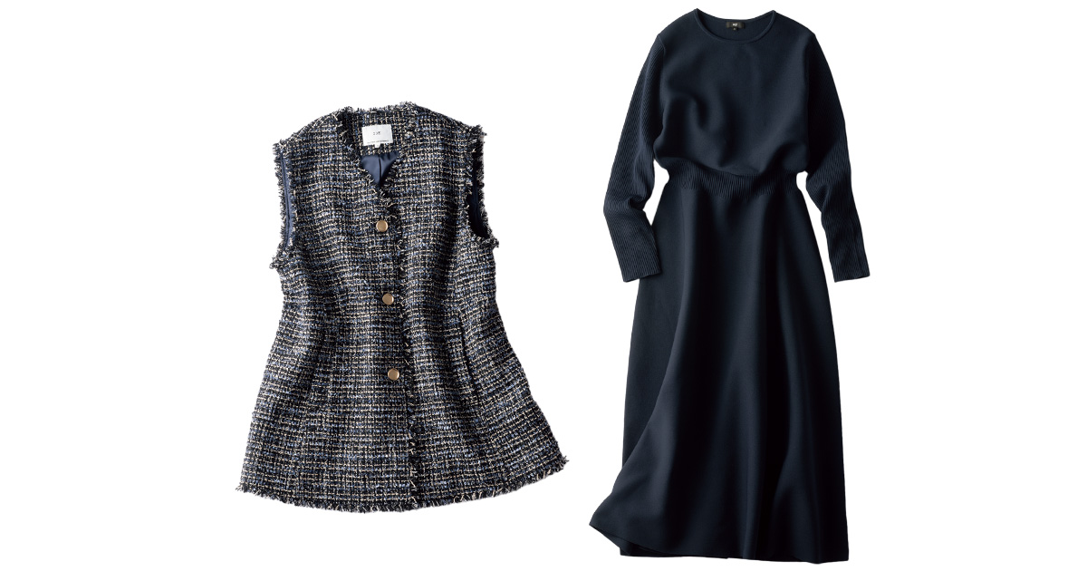ニットベスト¥42,900(エイトン/エイトン青山)スカート¥18,700(リランドチュール/リランドチュール プレスルーム)ピアス¥88,000リング¥124,300(ともにHirotaka/ヒロタカ 表参道ヒルズ)バッグ¥203,500(ヴァレクストラ/ヴァレクストラ ジャパン)トートバッグ¥17,600(ACOC/ジャック・オブ・オール・トレーズ プレスルーム)ブーツ¥99,000(ネブローニ)