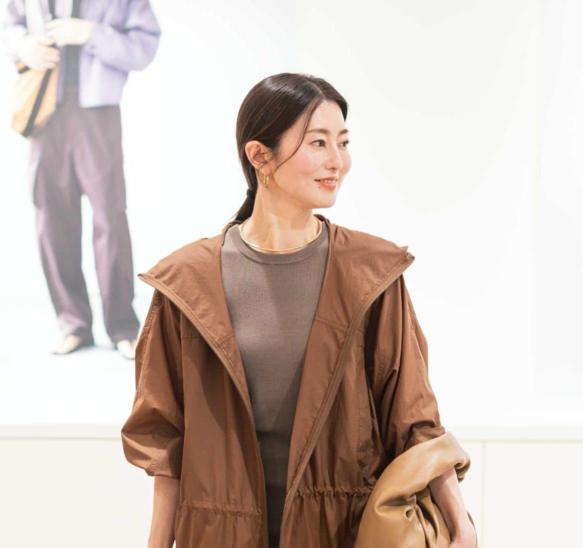 ユニクロの白と黒のタートルの重ね着と白パンツを合わせてボアアウターを脇に抱えた咲和希さん