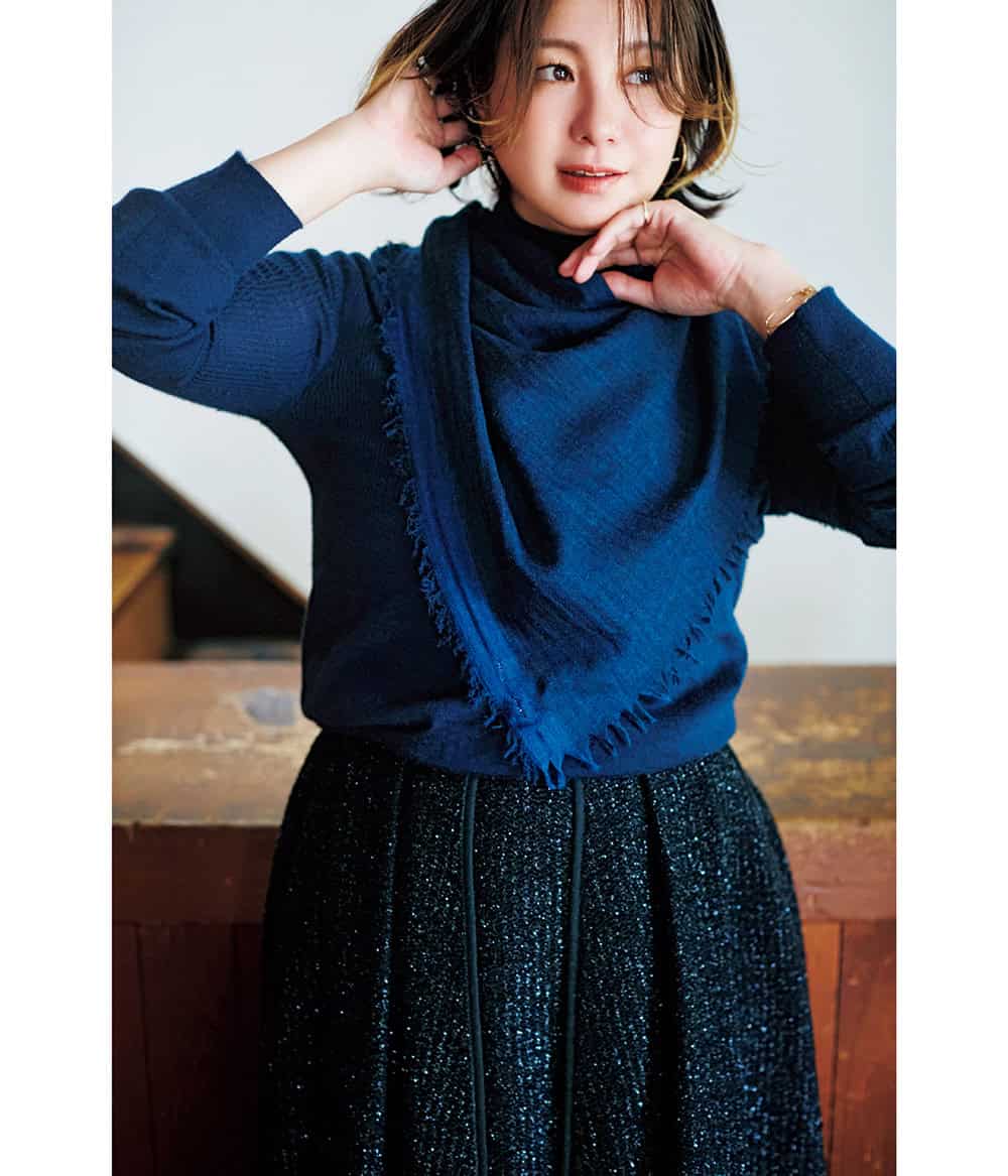 スカート¥24,970(ネイヴ/オンワード樫山)ジャケット¥41,800(ジャスグリッティー)ニット¥16,500(ドレステリア/ドレステリア 渋谷スクランブルスクエア店)ベルト¥9,900(ラフィエ/フラッパーズ)バッグ¥26,400(ヴィオラドーロ/ピーチ)ストール¥75,900(ジョシュアエリス/グリニッジ ショールーム)パンプス¥42,900(ピッピシック/アルアバイル)ブレスレット¥12,600(アビステ)
