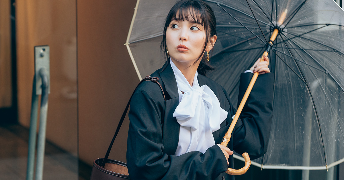 ブラウス¥27,000(シーニュ)パンツ¥88,000(アドーア)バッグ¥72,600(ピエール アルディ/ピエール アルディ 東京)ピアス¥8,800(イットアトリエ/フォーティーン ショールーム)リング[右手人さし指]¥27,720(フェルセラ/ズットホリック)リング[右手薬指]¥2,640(アネモネ/サンポークリエイト)