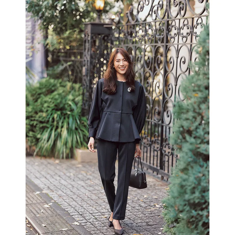 ジャケット¥20,900パンツ¥17,600(ともにスリースクエア)バッグ¥17,600ブローチ¥6,820ネックレス・ピアス[セット販売]¥3,850(すべてVS セレクション)パンプス/スタイリスト私物