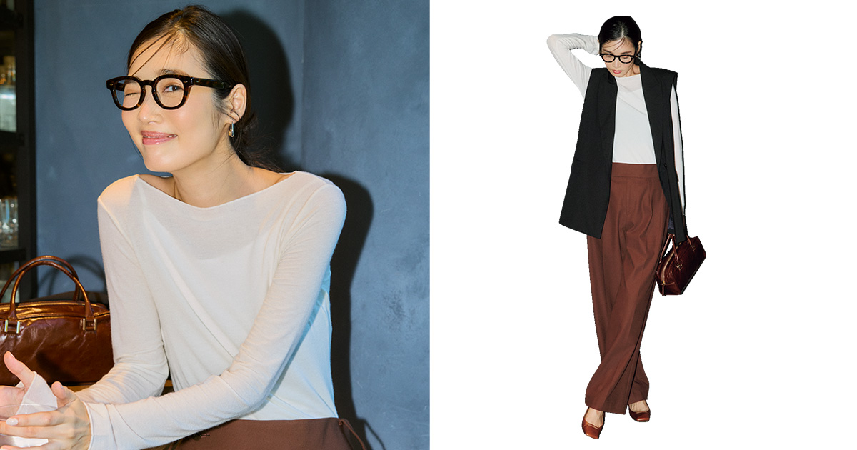 ロンT感覚でヘルシー顔なのに、実は女っぽいギャップが一枚上手。旬なブラウンで秋ムードを高めて。カットソー¥7,990(インティミッシミ/インティミッシミ 渋谷文化村通り店)ジレ¥42,900(プルミエ アロンディスモン/プルミエ アロンディスモン NEWoMan新宿)パンツ¥36,300(タンジェント/The Edit Store)ピアス¥3,300(ヘンカ/ロードス)メガネ¥46,200(アイヴァン/アイヴァン 東京ギャラリー)バッグ¥41,800(MAURIZIO TAIUTI/ピモンテ)靴¥64,900(ペリーコ/アマン)