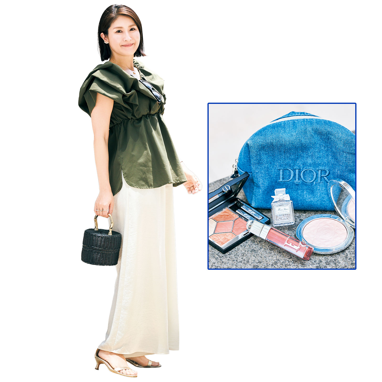 ディオールの今夏限定サンク クルール647でナチュラルな目元に。ディオール リップ グロウ004&マキシマイザー004を重ねて、夏っぽいジューシーコーラルリップが完成。ディオールのコンシーラーはお直し用。ステラボーテの美容スティックで外出先でもむくみオフを徹底!