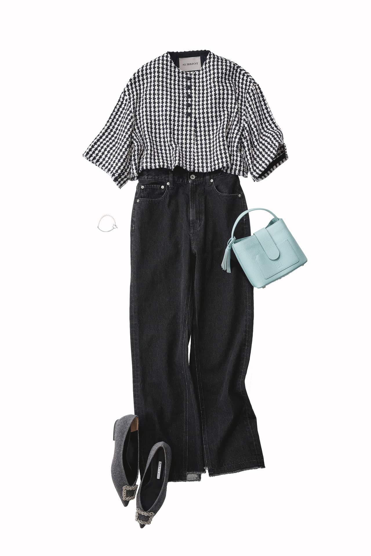 ジャケット¥66,000(オブリオ)パンツ¥16,500(サロン アダム エ ロペ/ジュンカスタマーセンター)バッグ¥35,200(FAVORITE SUKINAMONO/フランドルカスタマーサービス)パンプス¥46,200(PIPPICHIC/ユナイテッドアローズ 渋谷スクランブルスクエア店)ブレスレット¥47,300(Pearl for Life/ロードス)