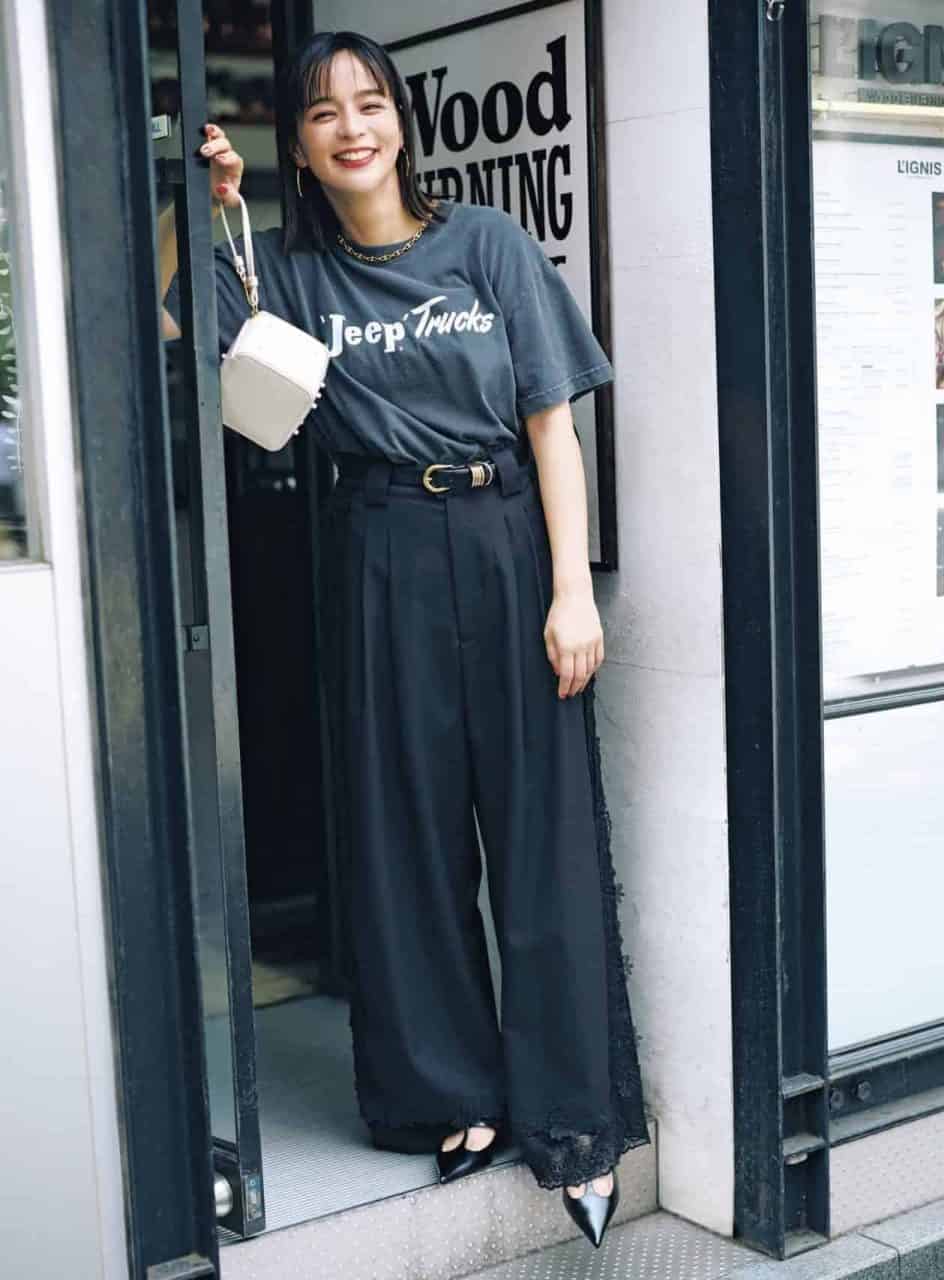 Tシャツ¥6,380(グッドロックスピード)パンツ¥18,700(ラベルエチュード)ベルト¥58,300(デアンシェ/エスアンドティ)バッグ¥13,200(ツル バイ マリコ オイカワ)パンプス¥69,300(ペリーコ/アマン)ピアス¥49,500(エンド カスタム ジェラーズ×ハイク/ボウルズ)ネックレス¥24,200(メラキ/フラッパーズ)