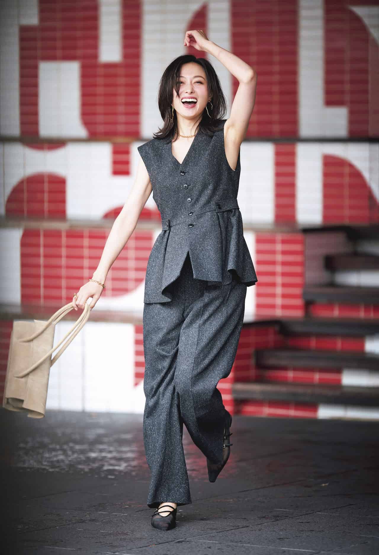 秋素材「ジレ×ワイドパンツ」のセットアップ