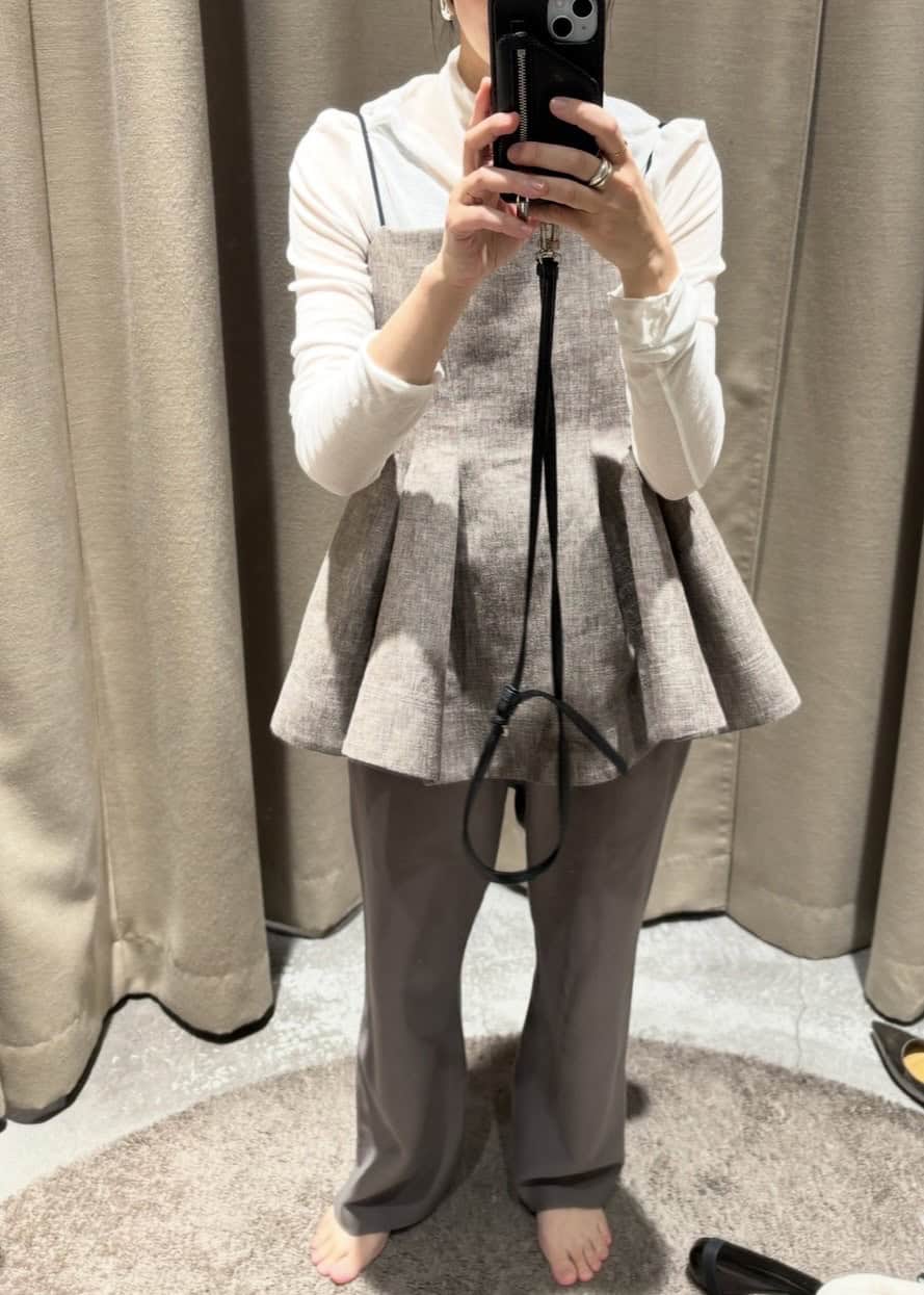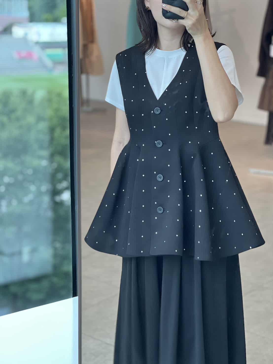 1枚で着映える構築的なデザインに一目惚れ。甘くなりがちなベストでも、ハリのある綿リネン独特の風合いが甘さを程よく抑えてくれるので大人っぽく着られそうです。ランチもナイトアウトも重ね着のレイヤード次第で楽しめそうなのも嬉しいポイント。