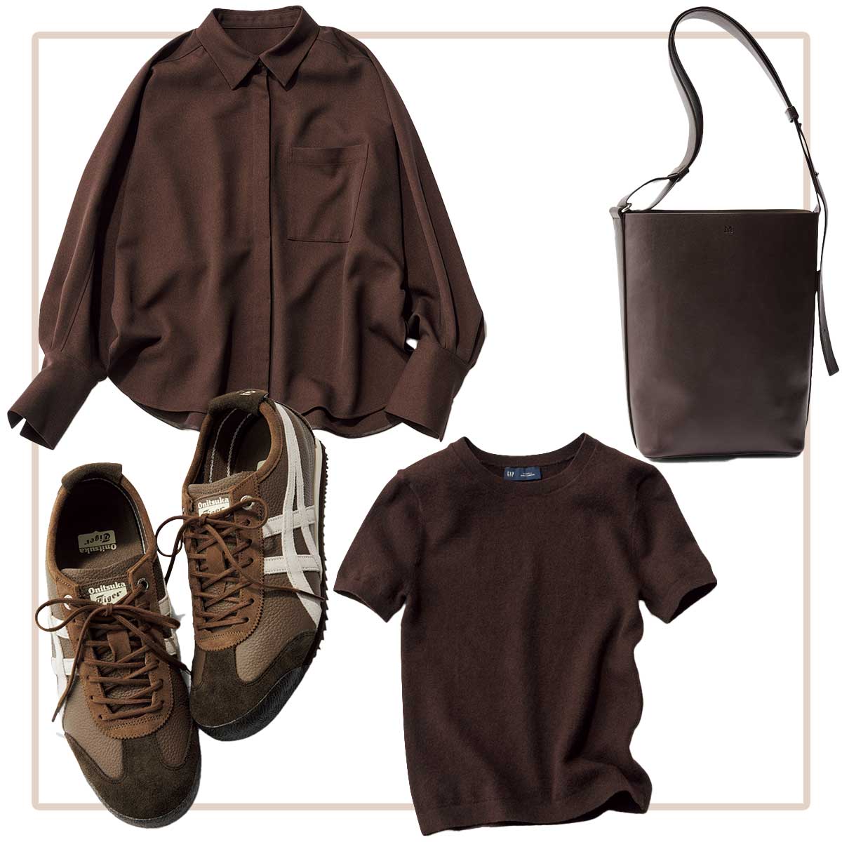 川瀬:いつもの白Tや白シャツをブラウンに変えるだけでも素敵ですよ。茶系に苦手意識があるなら、顔まわりから遠い小物から始めてみて!