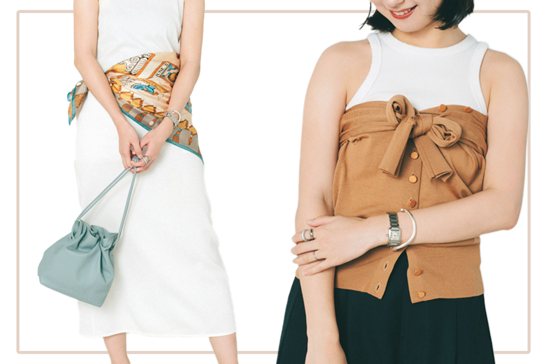 川瀬:ワンピやパンツなど、シンプルなコーデのアクセントにしたり、サングラスをかけてレトロにすると◎。あと、最近はカーディガンを巻くアレンジも増えています。ネクタイ巻き、ストール巻き、チューブトップ巻き…羽織りではなく、巻く前提で考えるとオシャレの幅が広がります!