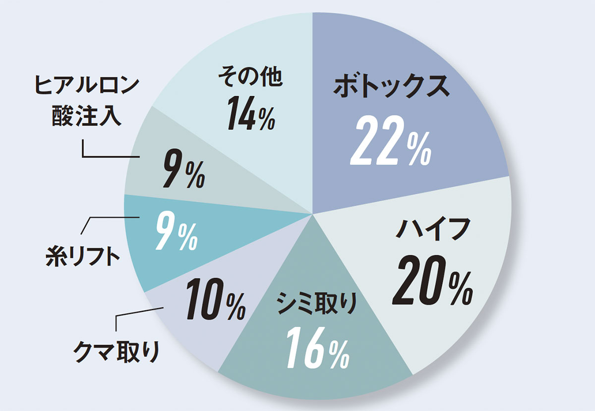 40代以降は9割以上が美容医療経験者。1種類だけでなく、複数のメニューを組み合わせて施術を受けている人もいましたが、ダウンタイムが比較的短いものが人気であることが顕著でした。