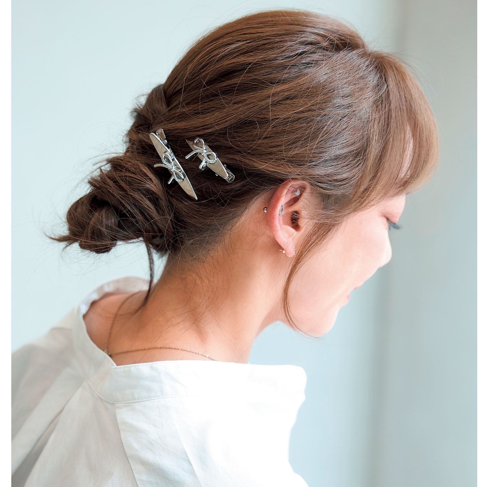 三つ編みをして、トップの髪をつまんでふんわり。三つ編み部分を捻って、くるっとまとめ、ヘアクリップを飾りました。