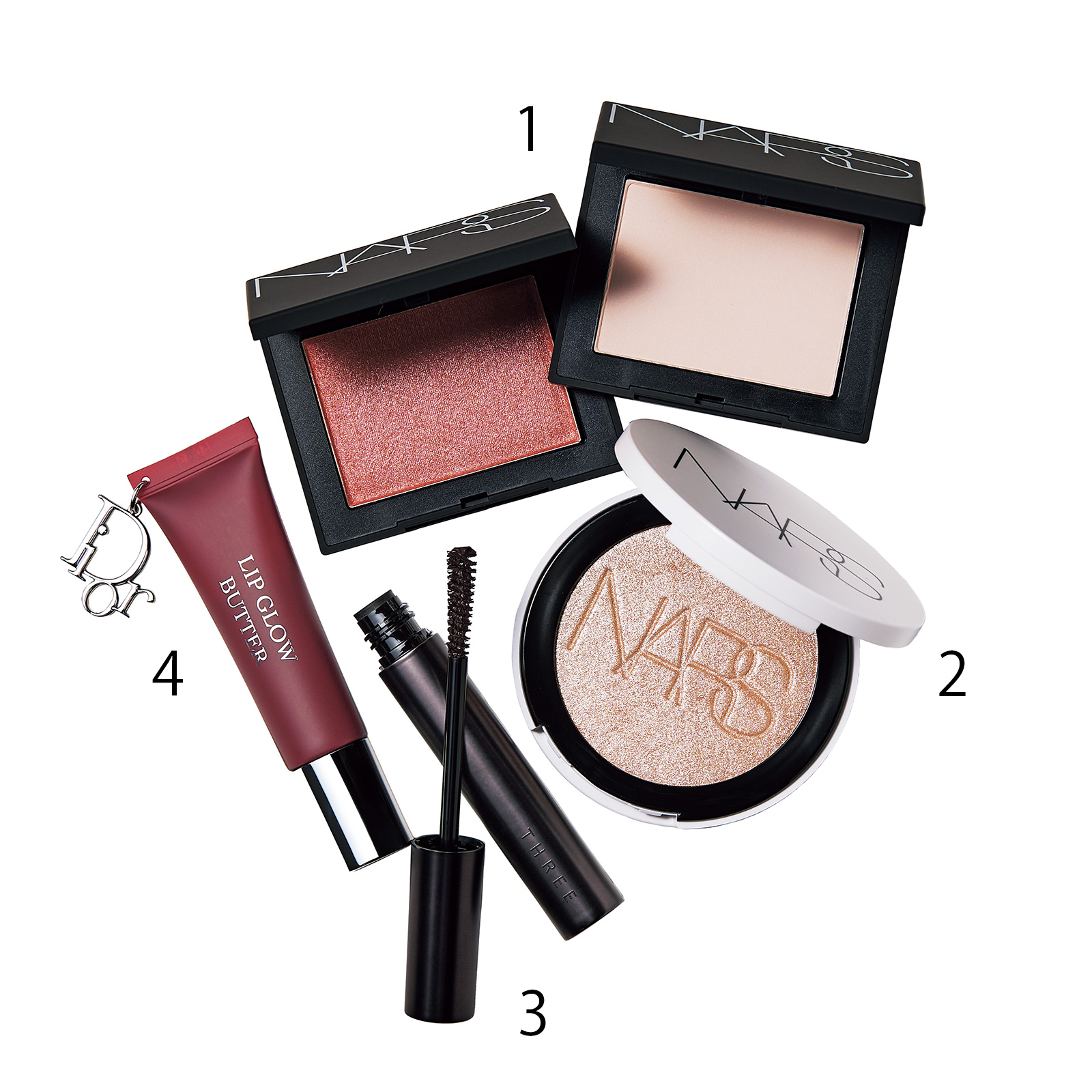 頰は自然な血色を演出しながらも顔のたるみをフラットに見せるオフホワイトのパウダーも仕込んで。欲しい立体感を作るハイライトも必須。