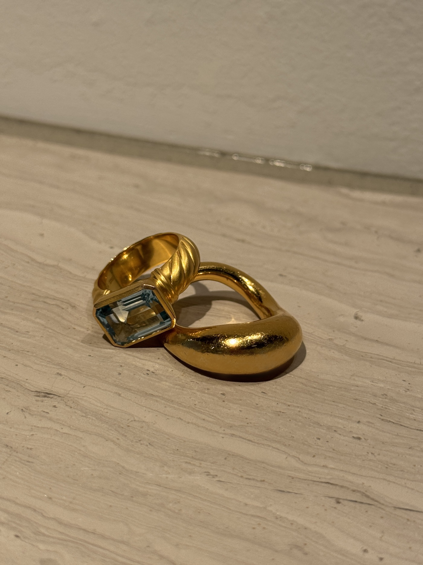 もうひとつ身につけている色石のリングは、ヴィール(vveer)のもの。こちらは今シーズンからスタートした、エストネーション発のジュエリーブランドです。初コレクションの中でも、ブルートパーズのこのリングをずっと狙っていました。自分自身のラッキーカラーがブルーなので、ローンチ後すぐに購入。おもちゃのような可愛さもあり、手もとを華やかに美しく見せてくれるので気に入っています。