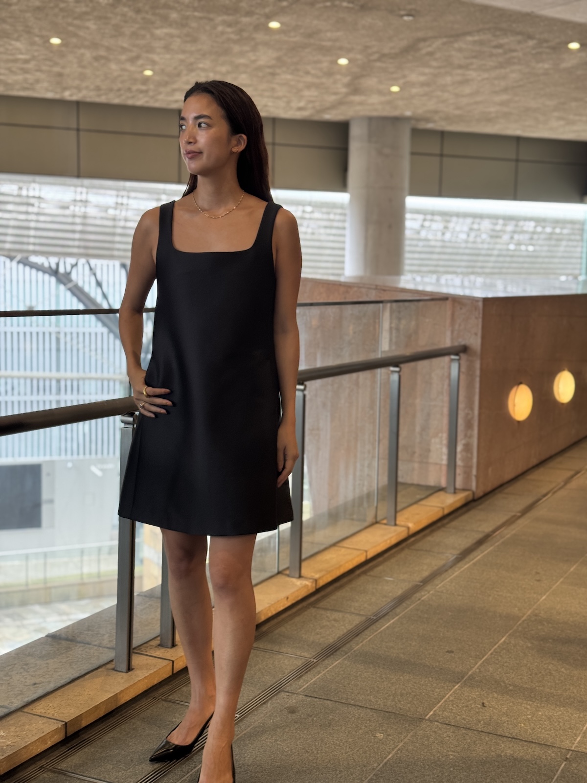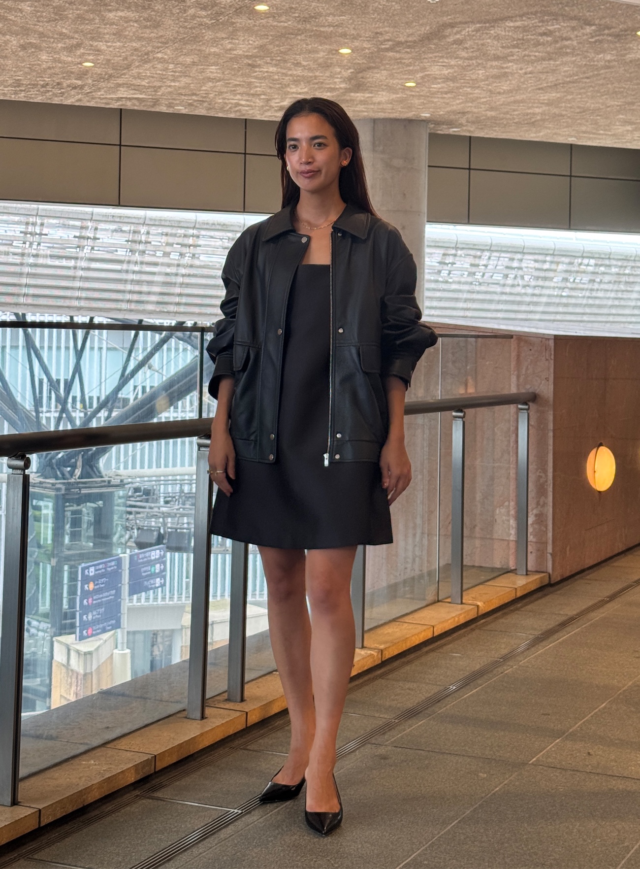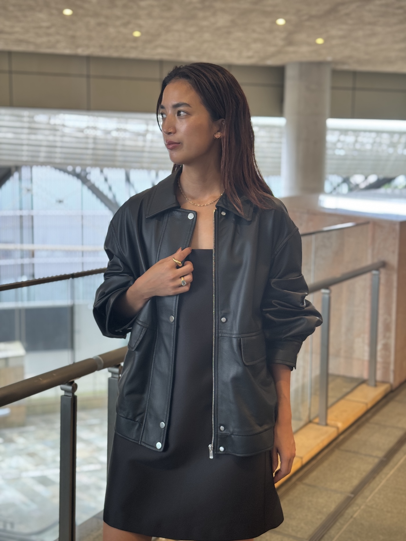 甘めのミニドレスに、今シーズン、マストアイテムであるレザーライクなブルゾンを合わせて、オールブラックのスタイリングにしました。肌見せをしつつ、焼けた肌が映えるゴールドジュエリーを添えて、洋服もジュエリーも映えるように意識しました。
