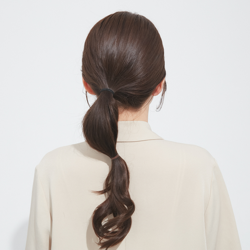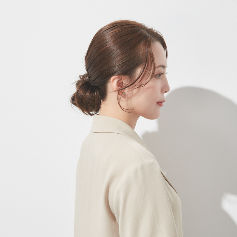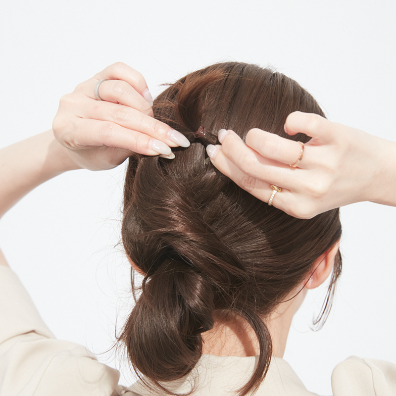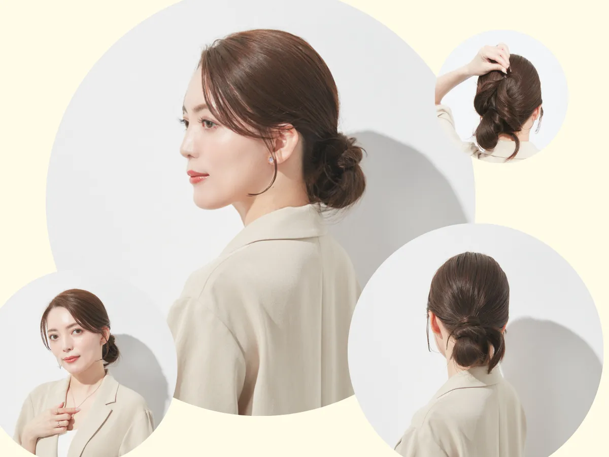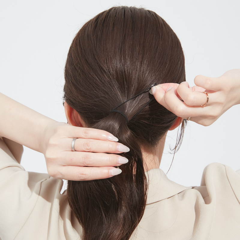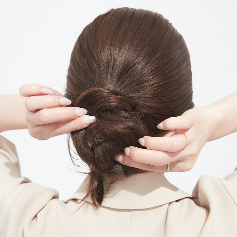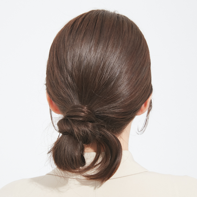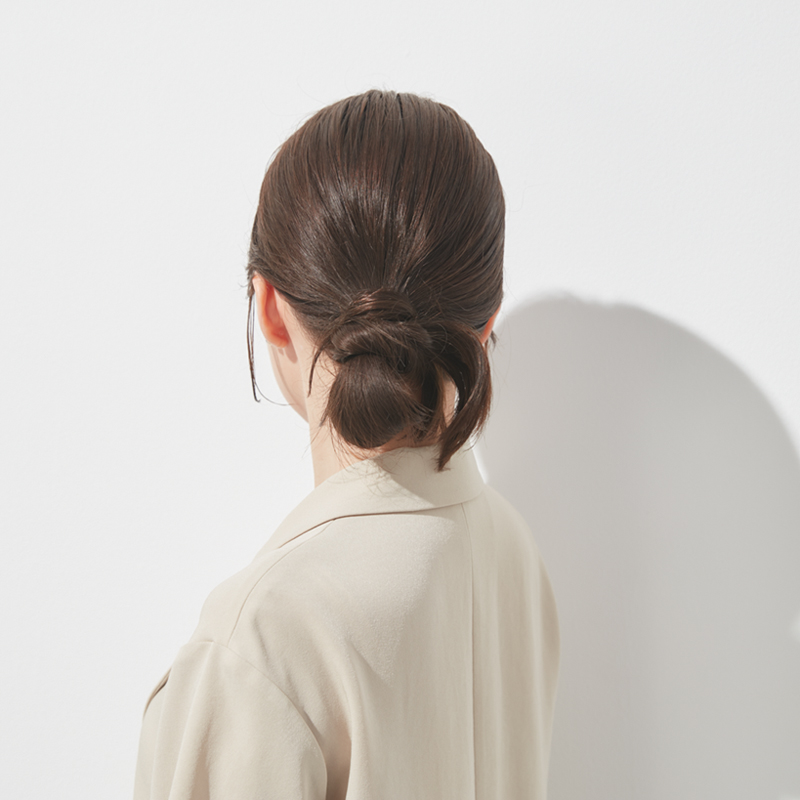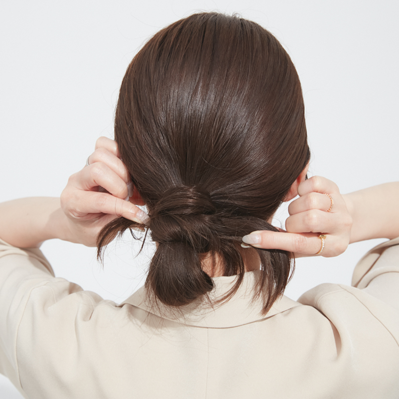 フォーマルから普段のお出かけまで活躍するシニヨン。きれいめに仕上げるポイントは、「低めの位置でまとめる」こと、そして「髪の表面を整えてきれいに見せる」こと。今回使うのは、ゴム3本だけ。低めの位置でひとつ結びにしたら、毛束の中間をゴムで結んで毛先を上に持っていきます。この工程だけでシニヨンができ上がるので、あとは持ち上げた毛束の穴にシニヨンを通すだけ。何本もピンを使って留めたりしなくてもまとまりやすいので、一度覚えてしまえば簡単。大切な日の朝、慌てることがありません。