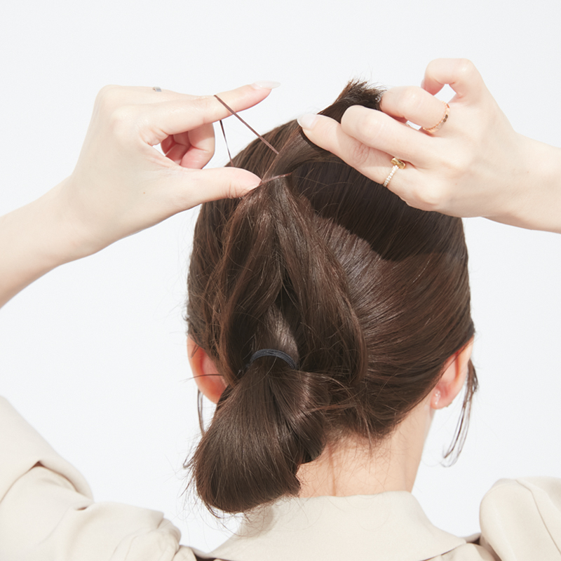 4.輪の穴の中に上からシニヨンをくぐらせる。