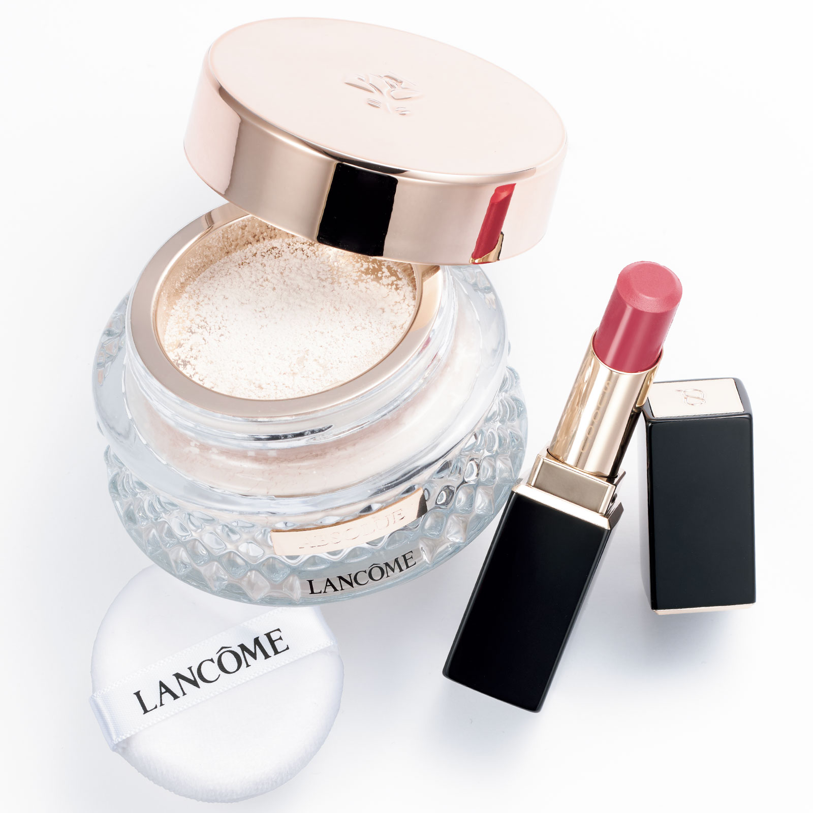 左:アプソリュ エッセンス イン パウダー 15g ¥16,610(ランコム)右:モイスチャー グレイズ リップスティック 02 ¥5,830 ※セット価格(SUQQU)