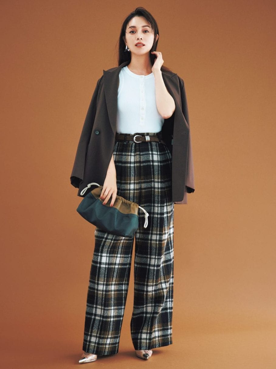 深みブラウンのジャケットは、コーデに秋らしさが高まり、洒落っぽく仕上がります。カラー合わせが苦手な方も、黒っぽく着こなせるダークブラウンなら着やすいはず。今旬らしいブラウンチェックのパンツと合わせて統一感UP!