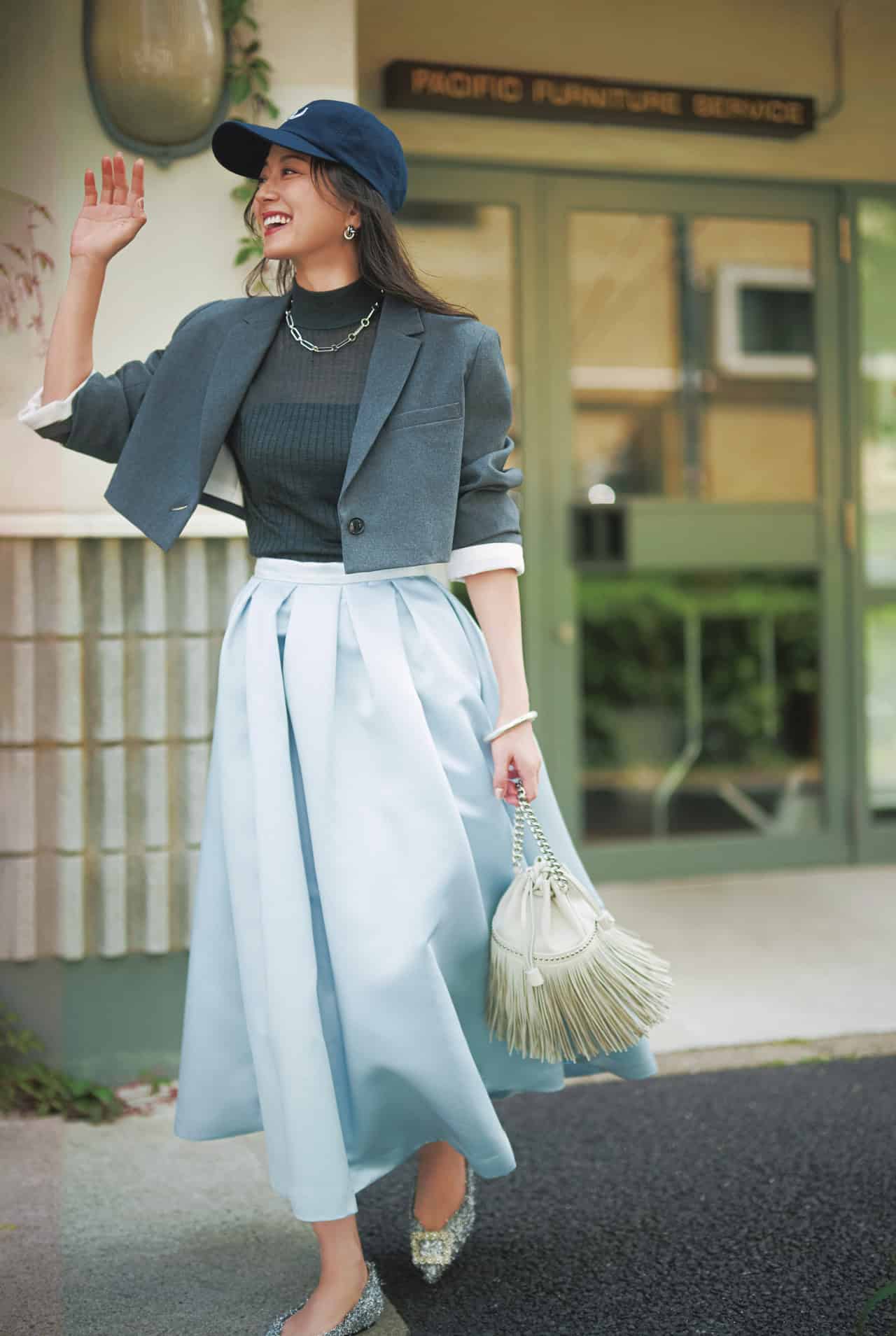 クロップドジャケット¥49,500(styling//styling/ ルミネ新宿1店)半袖ニット¥36,300(チノ/モールド)スカート¥33,000(ツル バイ マリコ オイカワ)バッグ¥165,000(J&M デヴィッドソン/J&M デヴィッドソン カスタマーセンター)パンプス¥46,200(ピッピシック/ベイジュ)キャップ¥3,990(アンフィーロ)ピアス¥6,600ネックレス¥15,400(ともにダブルスタンダード クロージング/フィルム)ブレスレット¥70,840(バルブス/ZUTTOHOLIC)