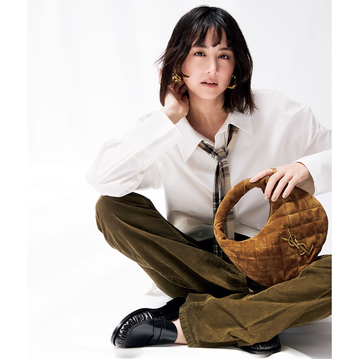 「秋っぽ小物」の効果は絶大。スエード素材のバッグはスペシャル感もあって気分も上がります。ちなみに春夏に持ってもむしろオシャレ、今しか持てないわけではありませんのでご安心を。シャツ¥214,500タイ〈チェックシャツとセット〉¥195,800パンツ¥148,500バッグ[イカリーノ]〈H16×W22×D7.5cm〉¥445,500ローファー¥154,000ピアス¥137,500リング¥52,800(すべてサンローラン バイ アンソニー・ヴァカレロ/サンローラン クライアントサービス)