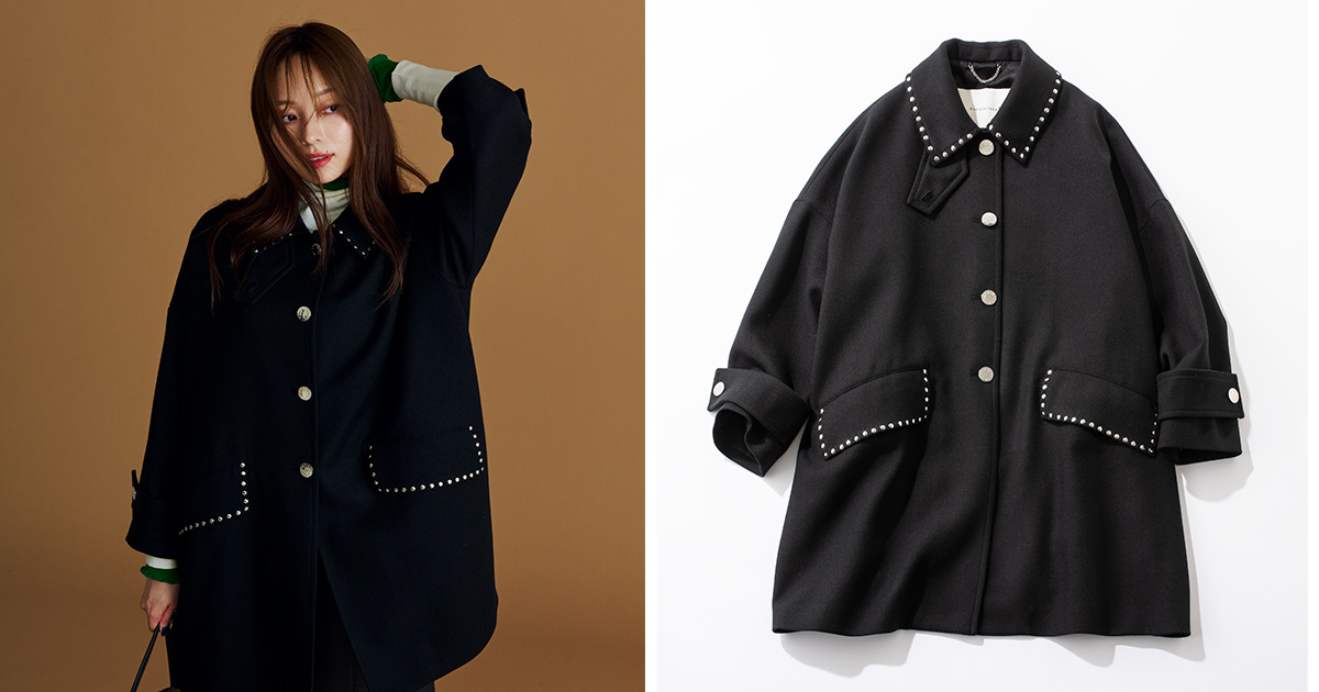 アイコンとして長く愛される「ハンビー」。端正なAライン&ドロップショルダーのシルエットが人気の理由。スタッズデザインはジュエリー要らずの華やかさ。秋から着られるドライタッチの素材で8月から売れ続けています。