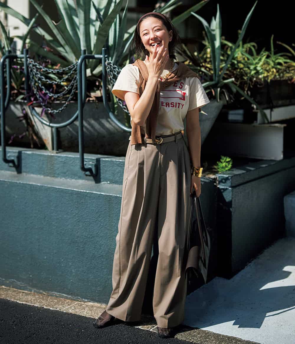 ロゴTシャツ¥16,500(アンスクリア/アマン)肩掛けにしたニットカーディガン¥25,300(ウィム ガゼット/ウィム ガゼット 玉川髙島屋S・C店)パンツ¥27,500(スリードッツ/スリードッツ 表参道店)ベルト¥13,200(レフィエ/フラッパーズ)バッグ¥44,000(モフィオラ/アマン)サンダル¥44,000(ダブルスタンダード クロージング/フィルム)カチューシャ¥26,400(アレクサンドル ドゥ パリ/アレクサンドル ドゥ パリ GINZA SIX店)ネックレス¥35,200(ローラ ロンバルディ/八木通商)バングル¥61,600(ソコ/ZUTTOHOLIC)