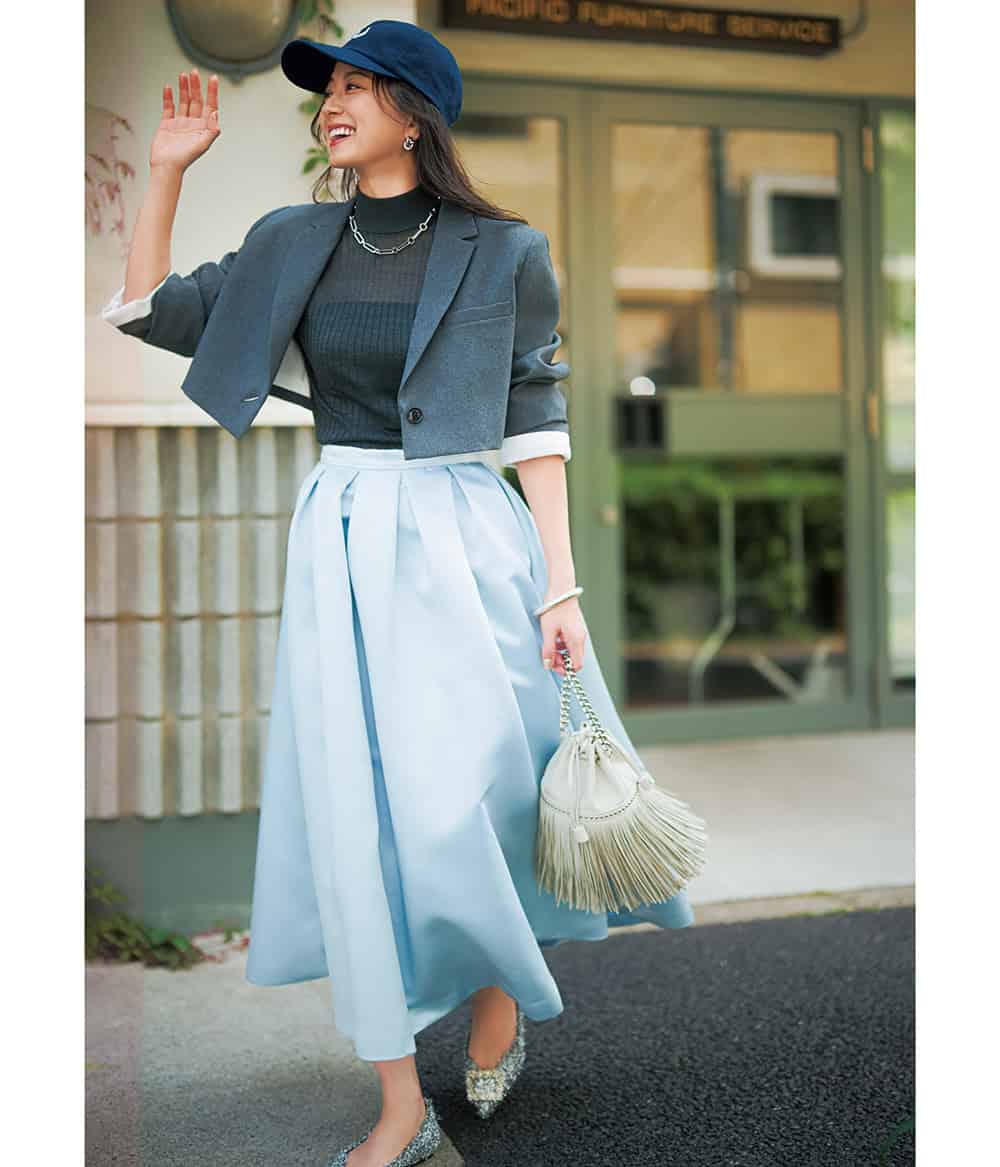 クロップドジャケット¥49,500(styling//styling/ ルミネ新宿1店)半袖ニット¥36,300(チノ/モールド)スカート¥33,000(ツル バイ マリコ オイカワ)バッグ¥165,000(J&M デヴィッドソン/J&M デヴィッドソン カスタマーセンター)パンプス¥46,200(ピッピシック/ベイジュ)キャップ¥3,990(アンフィーロ)ピアス¥6,600ネックレス¥15,400(ともにダブルスタンダード クロージング/フィルム)ブレスレット¥70,840(バルブス/ZUTTOHOLIC)