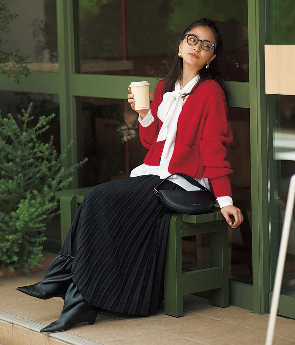 ニットカーディガン¥39,600(LE PHIL/LE PHIL NEWoMan新宿店)ボウタイブラウス¥8,910(ビーミング by ビームス/ビーミング ライフストア by ビームス ららぽーとTOKYO-BAY店)プリーツスカート¥37,400(サクラ/インターリブ)バッグ¥99,000(J&M デヴィッドソン/J&M デヴィッドソン カスタマーセンター)ブーツ¥46,200(ピッピシック/ベイジュ)メガネ¥42,900(プロポ/プロポデザイン)ピアス¥6,050〈プチ・モーメント〉バングル¥39,160〈ソコ〉(ともにZUTTOHOLIC)