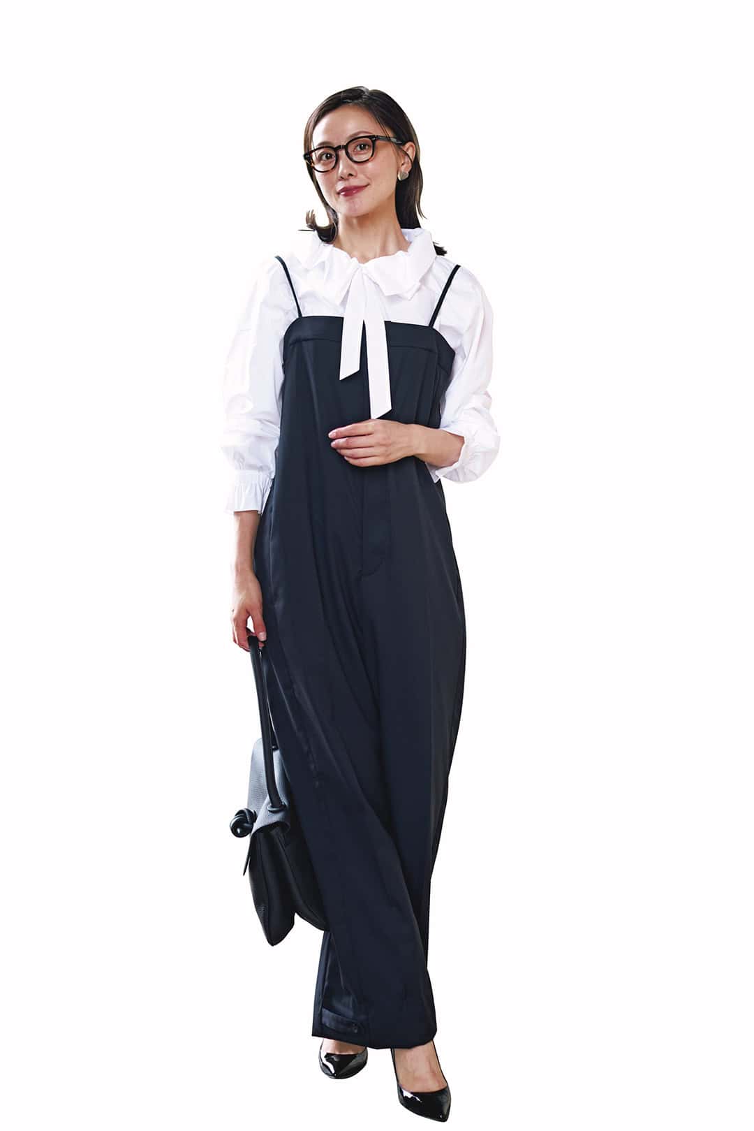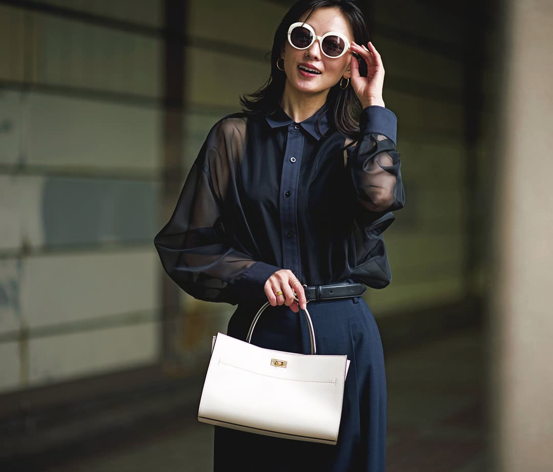 ブラウス¥29,700(デパリエ)バッグ¥59,400(ヴァジック/ヴァジックジャパン)靴¥26,400(銀座かねまつ/銀座かねまつ6丁目本店)メガネ¥42,900(アイヴァン/アイヴァン 東京ギャラリー)ピアス各¥23,100(マユ/マユ ショールーム)