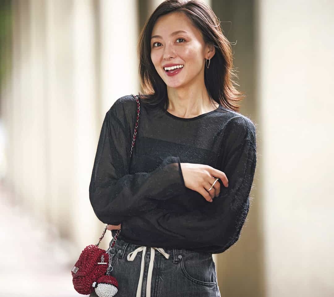 プルオーバー¥36,300(サヴィル サヴィ)キャミソール¥9,900(FRAY I.D/FRAY I.D ルミネ新宿2店) デニムパンツ¥33,000(ウィム ガゼット/ウィム ガゼット 玉川髙島屋S・C店)バッグ¥47,300チャーム¥38,500(ともにアンテプリマ/ワイヤーバッグ/アンテプリマジャパン)ピアス¥25,300(マユ/マユ ショールーム)リング¥35,200(リューク)