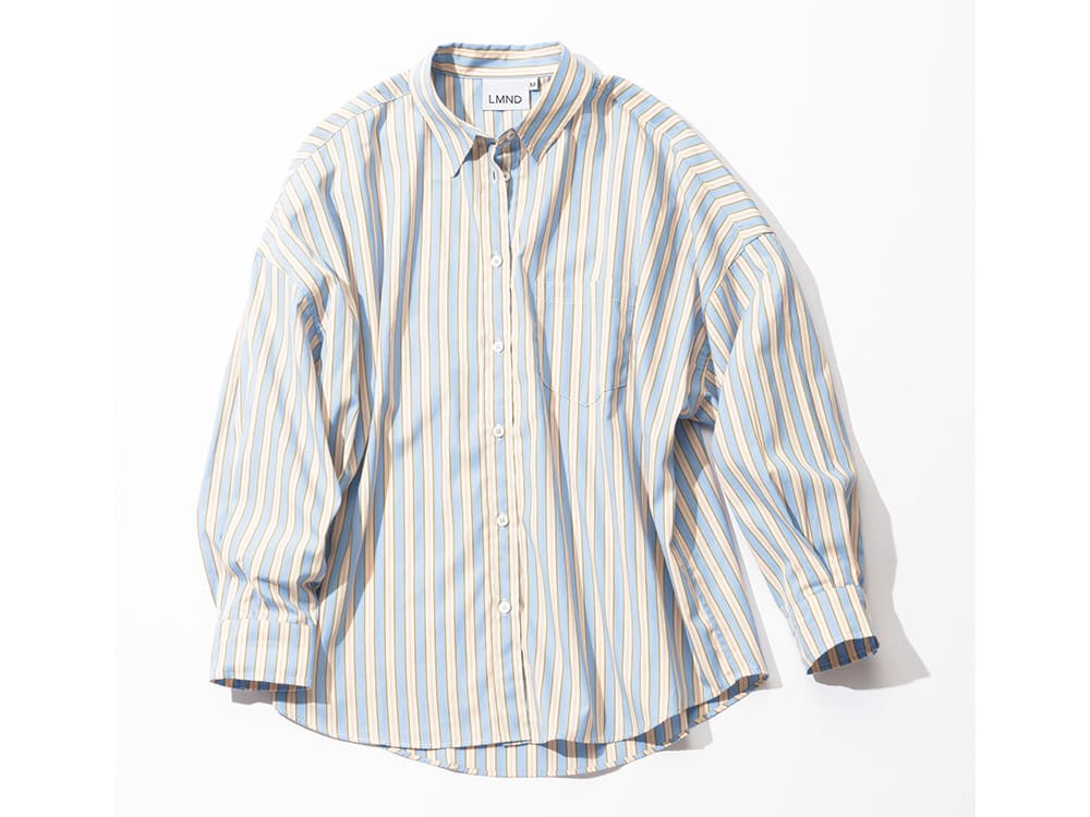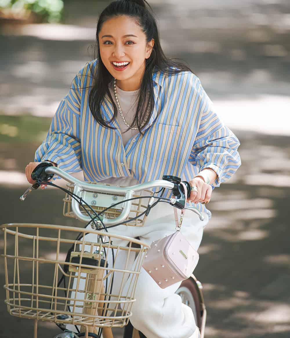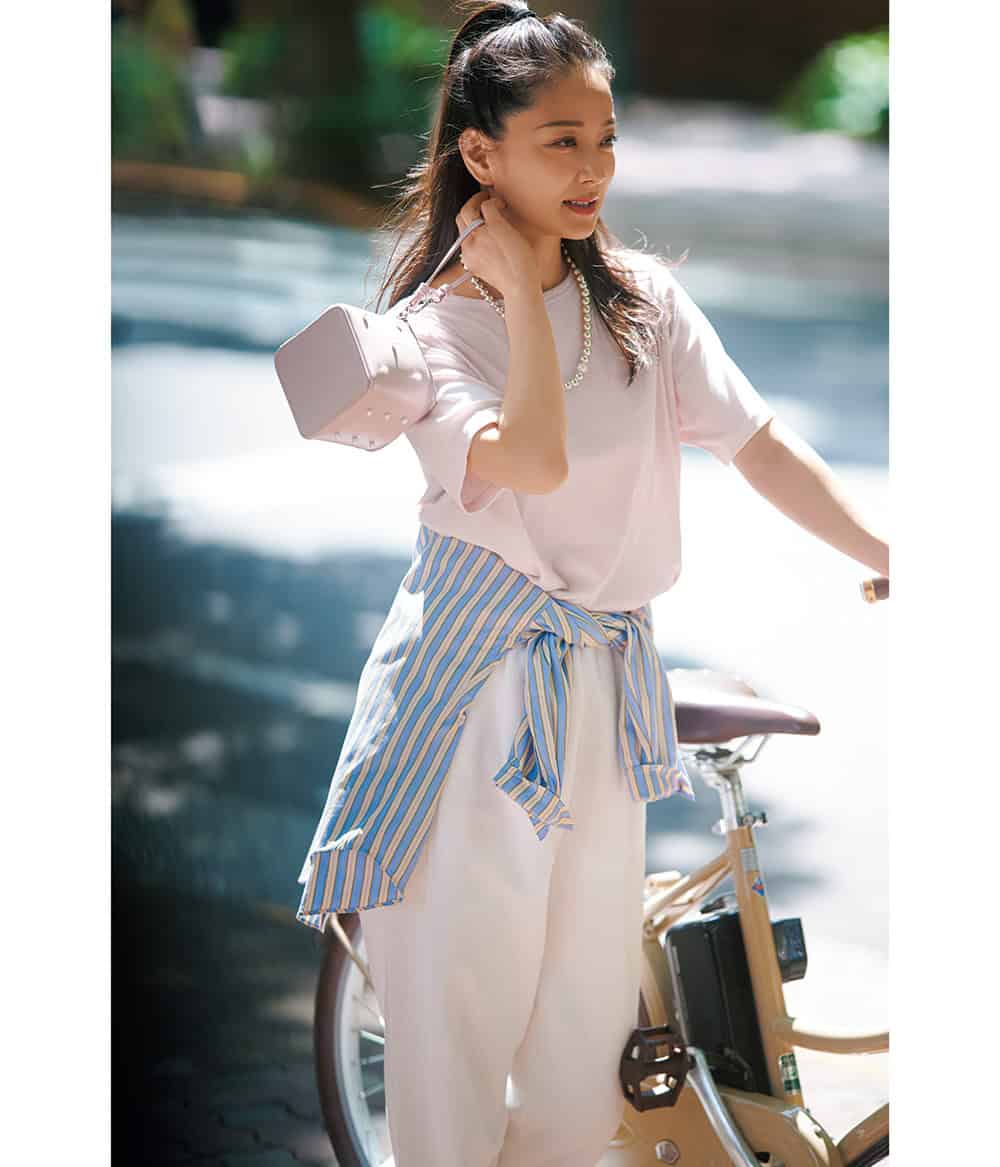 ストライプシャツ¥37,400(LMND/THIRD MAGAZINE)Tシャツ¥4,990(アンフィーロ)スウェットパンツ¥25,300(ティッカ)バッグ¥13,200(ツル バイ マリコ オイカワ)ネックレス¥58,080〈ペヨテ・バード・デザイン〉バングル¥80,520リング¥21,780〈ともにバルブス〉(すべてZUTTOHOLIC)