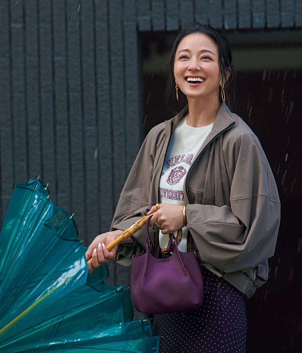 撥水ブルゾン¥59,400(LE PHIL/LE PHIL NEWoMan新宿店)ロゴ半袖ニット¥8,910ドットスカート¥12,980(ともにMila Owen/Mila Owen ルミネ新宿2店)バッグ¥40,700(ジャンニ キアリーニ/ジャンニ キアリーニ 銀座店)傘/スタイリスト私物ピアス¥33,110〈ベン・アムン〉バングル¥39,600〈エムシー・スタジオ〉リング2本セット¥39,160〈ソコ〉(すべてZUTTOHOLIC)