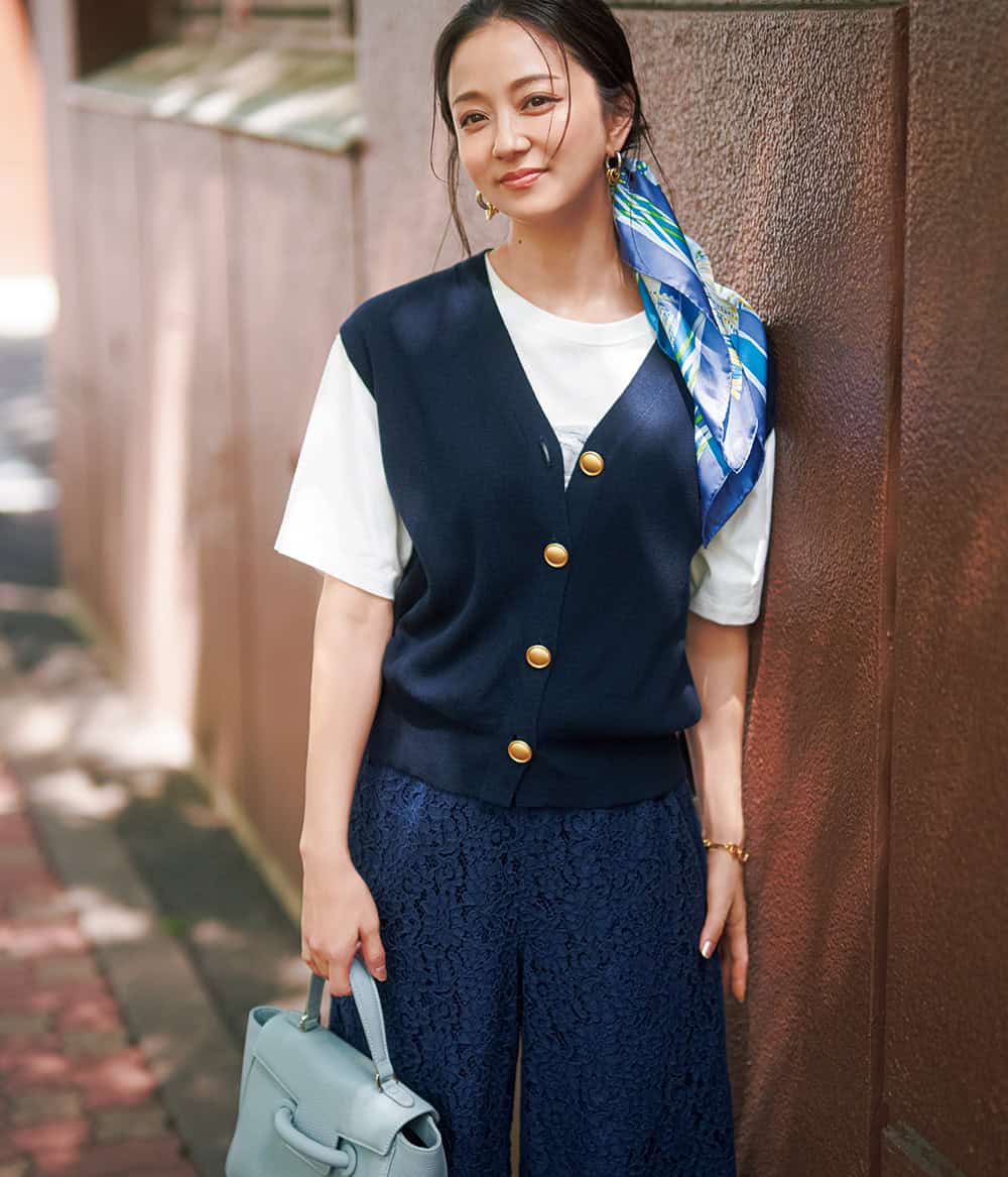 ニットジレ¥6,490(ビーミング by ビームス/ビーミング ライフストア by ビームス ららぽーとTOKYO-BAY店)Tシャツ¥3,990(アンフィーロ)レースパンツ¥34,100(THE TINY BIG SISTER/THIRD MAGAZINE)バッグ¥55,000(ヴァジック/ヴァジックジャパン)スカーフ¥22,000(マニプリ)ピアス¥39,600ブレスレット¥34,100(ともにローラ ロンバルディ/八木通商)