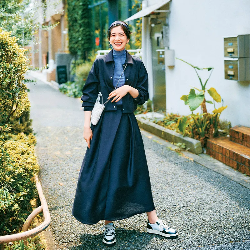 エミ スニーカー¥16,300(エミ/エミ ニュウマン新宿店)ブルゾン¥33,990(アンクレイヴ ホワイト/アンクレイヴ)ニットトップス¥39,600 スカート¥52,800(ともにカオス/カオス丸の内)バッグ¥146,300(ピエール アルディ/ピエール アルディ 東京)ネックレス¥37,400(イー・エム/イー・エム アオヤマ)