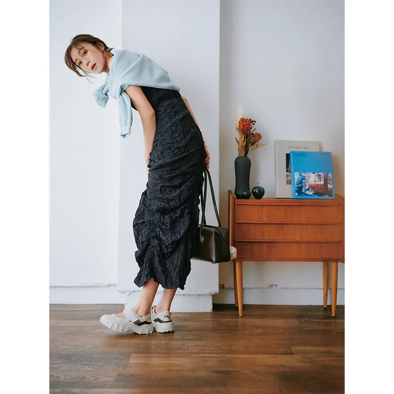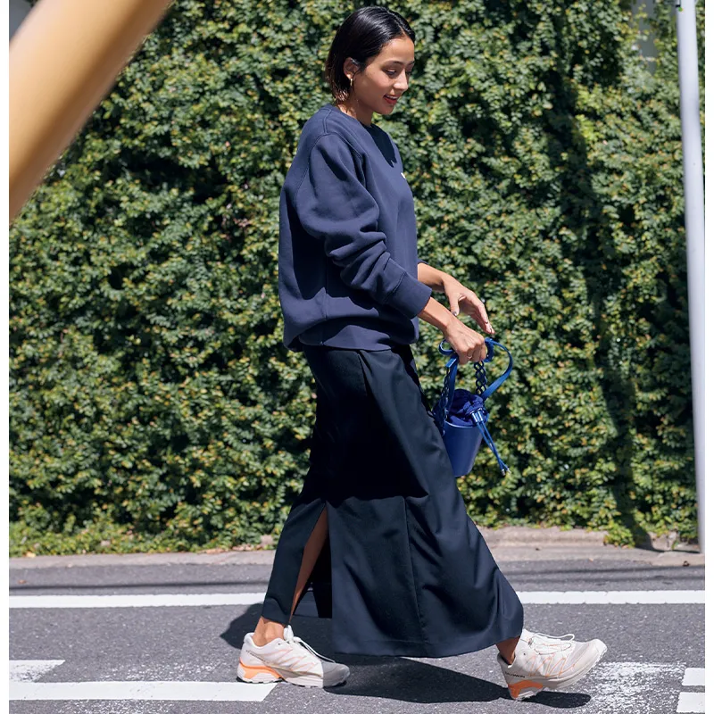黒スカート¥88,000(シートーキョウ/エスティーム プレス)スウェット¥20,900(エーケーワン/ビームス ハウス 丸の内)バッグ¥41,800(ヴァジック/ヴァジックジャパン)スニーカー¥35,200(デイト フォー ユナイテッドアローズ/ユナイテッドアローズ 渋谷スクランブルスクエア店)靴下¥2,200(ビーミング by ビームス/ビーミング ライフストア by ビームス ららぽーとTOKYO-BAY店)ネックレス/スタイリスト私物