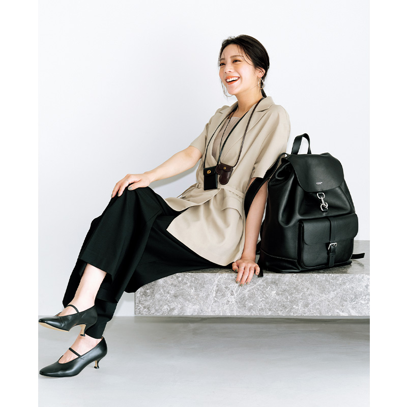 バックパック¥132,000【H41.5×W35×D15cm】ポーチ各¥19,800【スクエアH7.5×W6×D1cm/ハートH7.5×W7×D1cm】(すべてコーチ/コーチ・カスタマーサービス・ジャパン)ジャケット¥22,000(ストラ)中に着たキャミソール¥12,100パンツ¥23,100(ともにアンクレイヴ/オンワード樫山 お客様相談室)ピアス¥46,200(マリハ)リング〈左手〉¥61,600リング〈右手〉¥90,200(ともにヴァンドーム青山/ヴァンドーム青山 プルミエール 伊勢丹新宿店)パンプス¥75,900(ネブローニ)