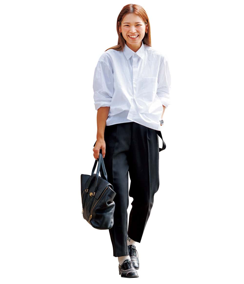 「シャツのボタンを掛け違いにして短か丈にアレンジ。ボタンも上までしっかり留めて、黒パンツを合わせれば格段ときちんと感UP。」(西村真菜実さん 40歳 身長171cm ヨガ講師)