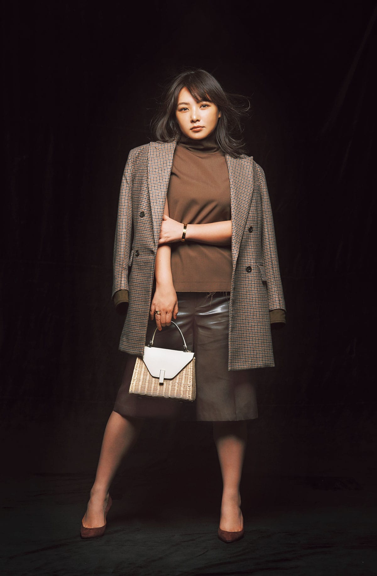 ジャケット¥75,900(venit/ノーブル有楽町マルイ店)ハイネックトップス¥23,980(イウエン マトフ/ユナイテッドアローズ 渋谷スクランブルスクエア店)ハーフパンツ¥9,900(ミラ オーウェン/ミラ オーウェン ルミネ新宿2店)バッグ¥748,000(ヴァレクストラ/ヴァレクストラジャパン)パンプス¥59,400(ペリーコ/アマン)バングル¥133,100リング¥90,200(ともにホアキン・ベラオ)