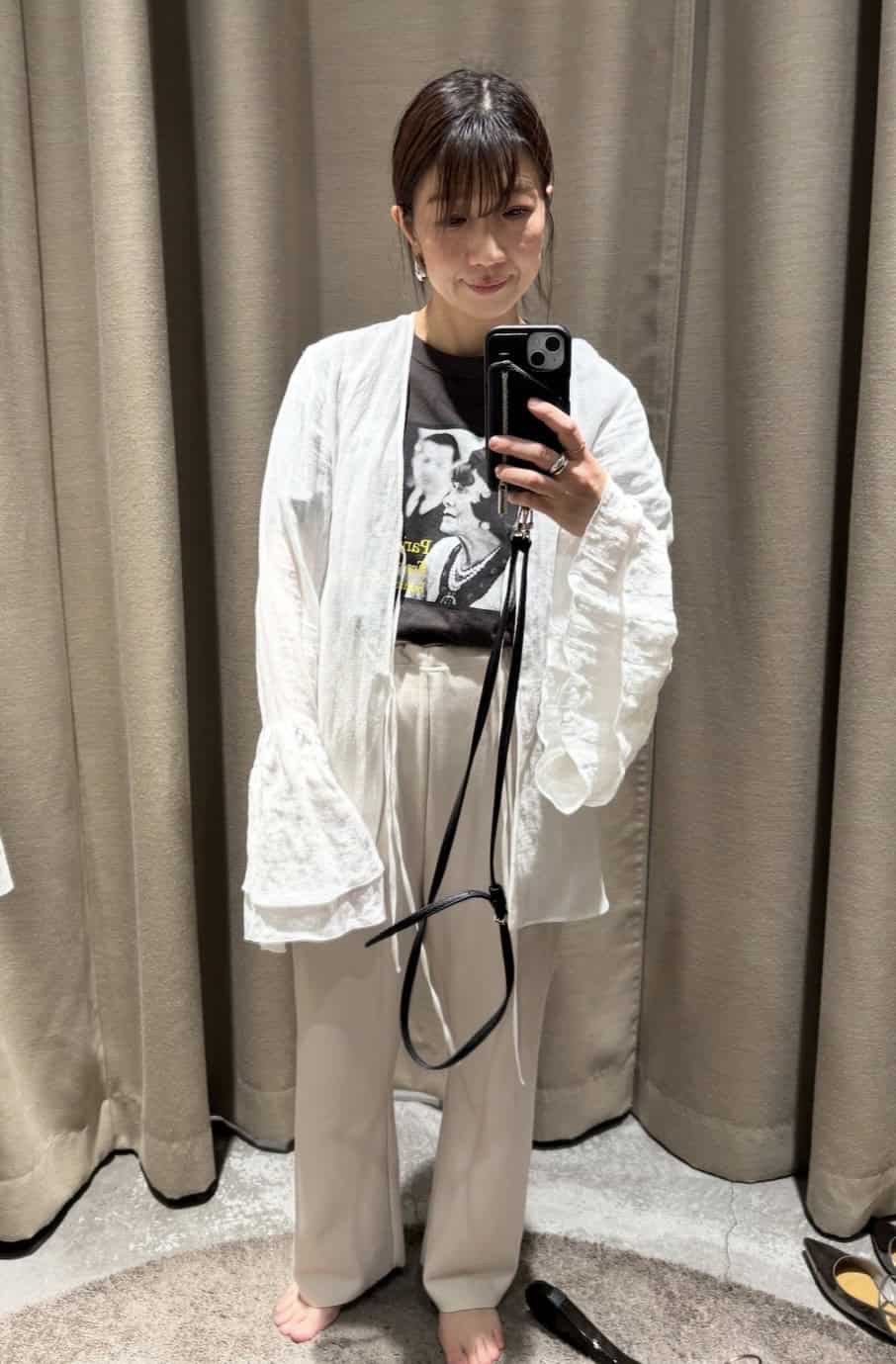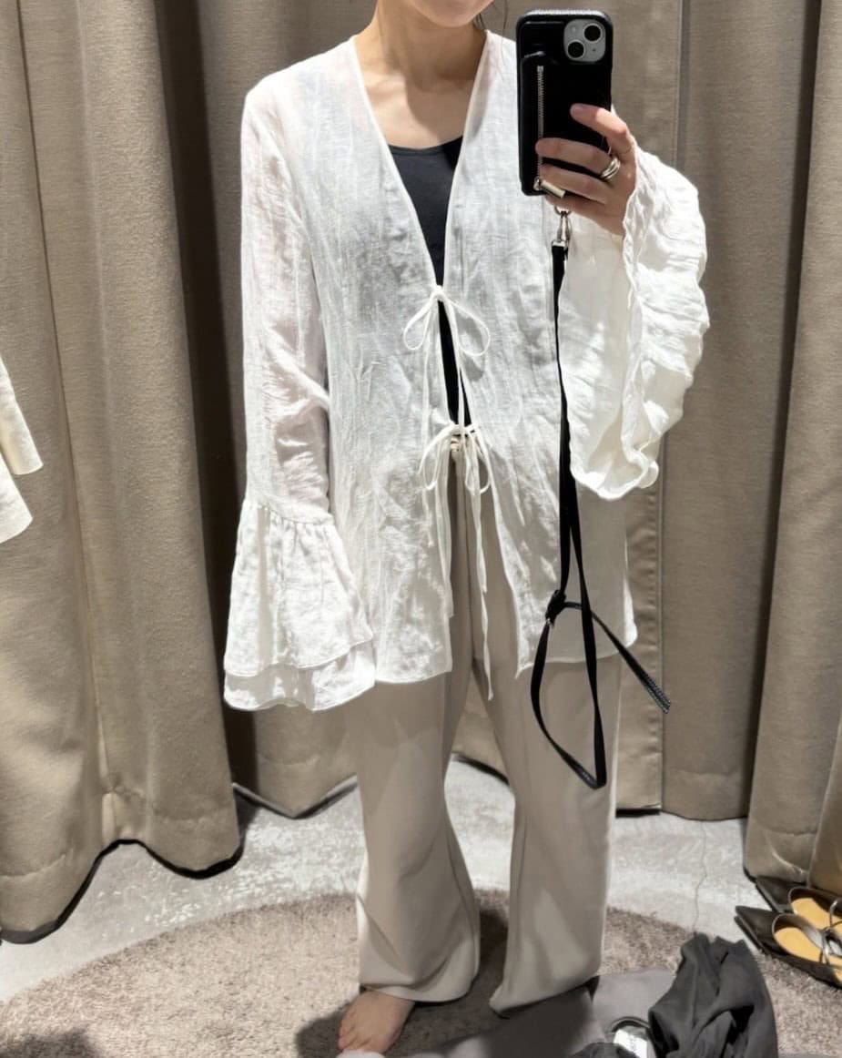 トップスとしてはもちろん、羽織としてレイヤードもできて着回し力抜群なので購入しました。ジャケットの袖からベルスリーブを出すコーデもオシャレです。フロントリボンは結んだりラフにオープンにしたりなど雰囲気を変えられるのも◎。フォトTやワンピの上から羽織って端境期コーデを楽しみたいです。