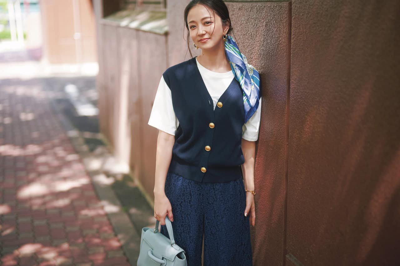 ニットジレ¥6,490(ビーミング by ビームス/ビーミング ライフストア by ビームス ららぽーとTOKYO-BAY店)Tシャツ¥3,990(アンフィーロ)レースパンツ¥34,100(THE TINY BIG SISTER/THIRD MAGAZINE)バッグ¥55,000(ヴァジック/ヴァジックジャパン)スカーフ¥22,000(マニプリ)ピアス¥39,600ブレスレット¥34,100(ともにローラ ロンバルディ/八木通商)