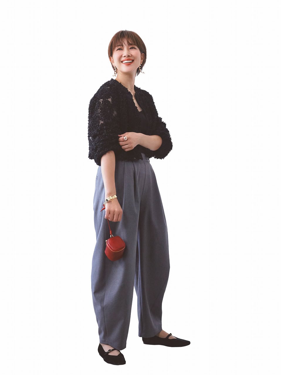 フォトジェニックな黒トップスで視線をぎゅっと上に引きつけながら、丸みある2タックパンツが立体感をプラス。スタイルアップも着映えも叶う、大人の華やかコーデです。