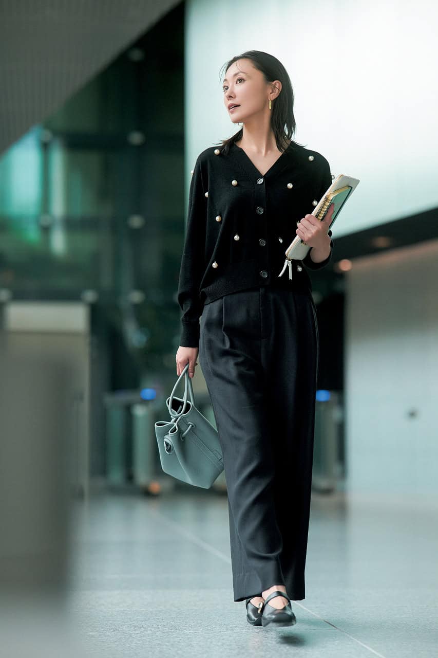 パンツと靴を黒で揃えてすっきり引き締まったシルエットに。ショート丈だから、オールブラックコーデにもリズム感が生まれます。パールがほんのり甘さをプラスした、オフィスでも浮かない大人可愛いコーディネート。