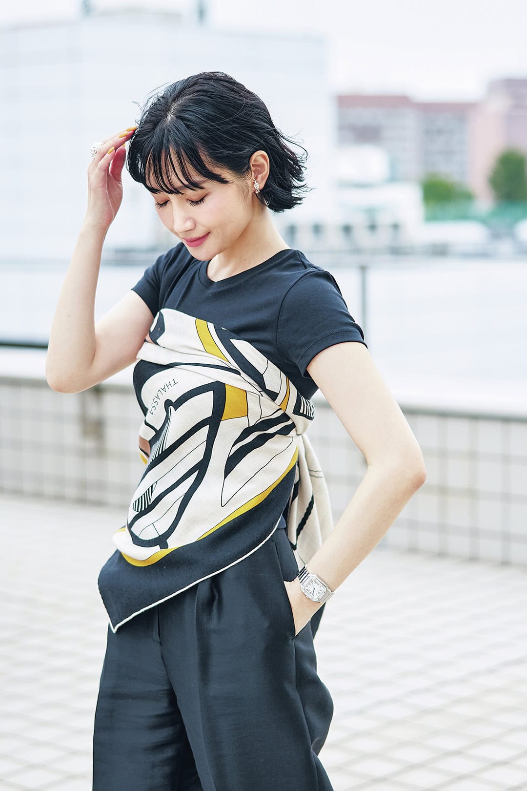 SCARF/Hermès TOPS/UNIQLO PANTS/Whim Gazette BAG/Hermès SHOES/Hermès JEWELRY/Hermès、Cartier