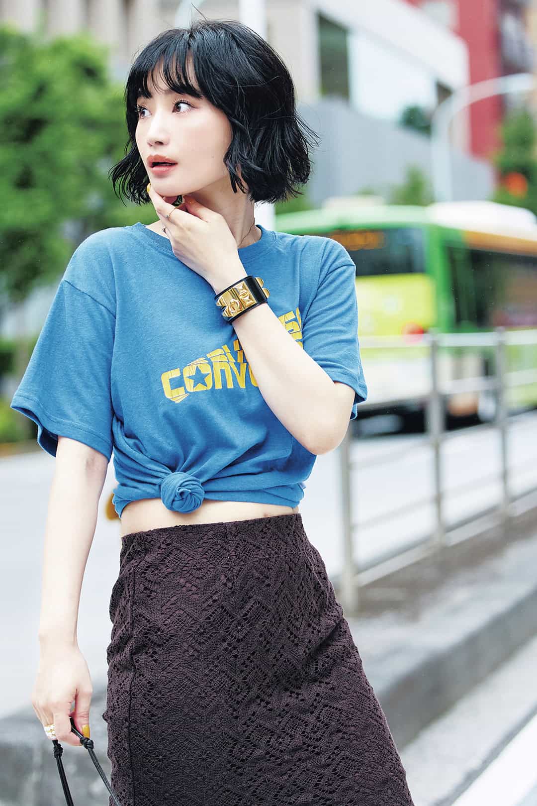 (着用アイテム)TOPS/CONVERSE SKIRT/IÉNA BANGLE/Hermès JEWELRY/Hermès、GOOSSENS Paris、HERE DITAS