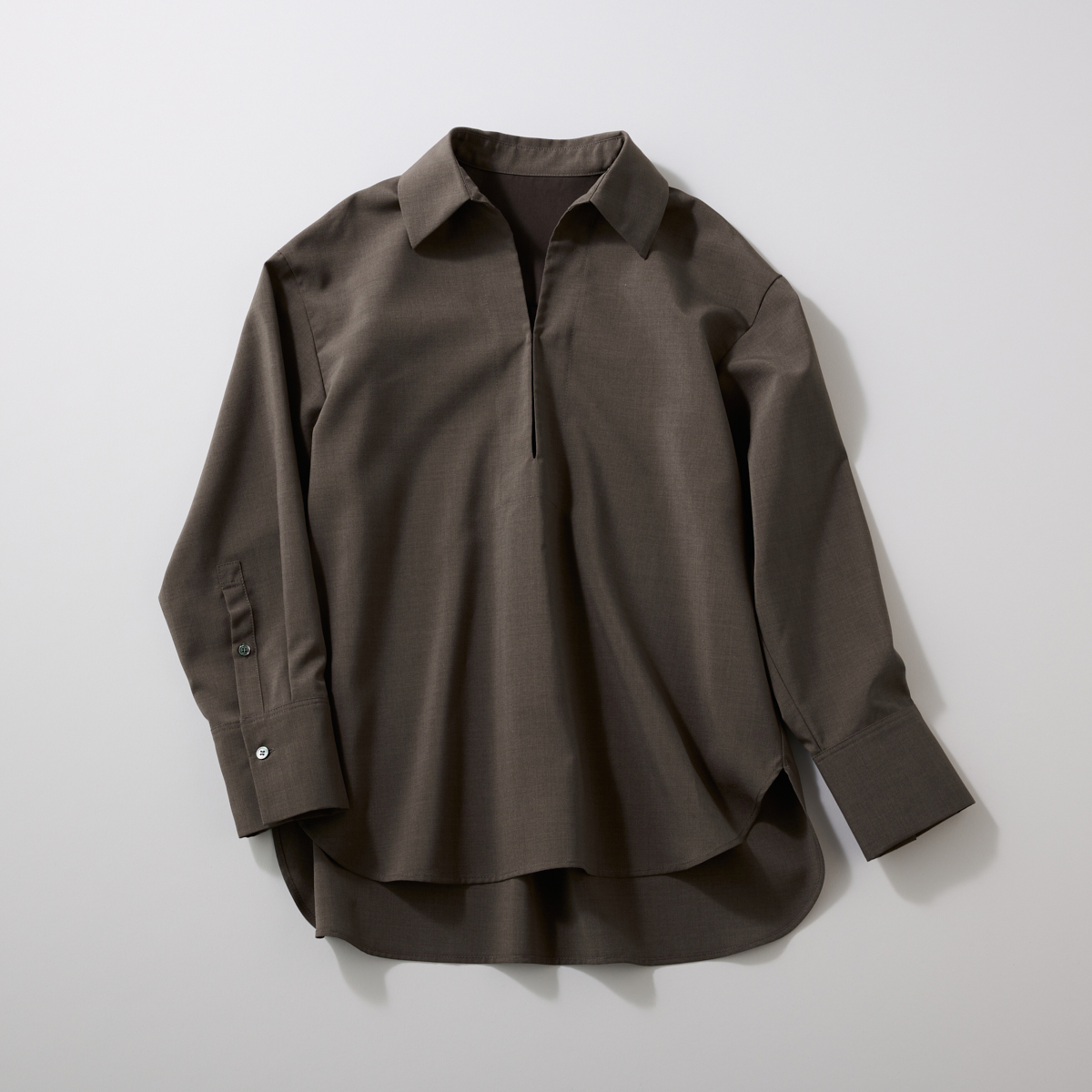 程よいストレッチで快適な着心地を叶える、ブランドの人気素材⁠⁠⁠⁠⁠⁠「CLEAN MOTION」を使用したドライタッチなスキッパーシャツ。朝から晩まで動きやすいのに上品な印象をキープ。顔周りをすっきり見せてくれる深めのVネックは、内側ホック付きで胸もとの開き具合を調節可能。フォーマルなシーンでも安心して着用できます。
